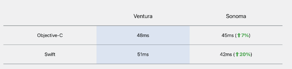 - Ventura에서는 Objective-C 브릿징 비용 때문에 Objective-C에서 직접 enumerateDates를 호출하는 것이 Swift에서 호출하는 것보다 더 빠르지만 Sonama에서는 동일한 기능이 Swift가 약간 더 빠름