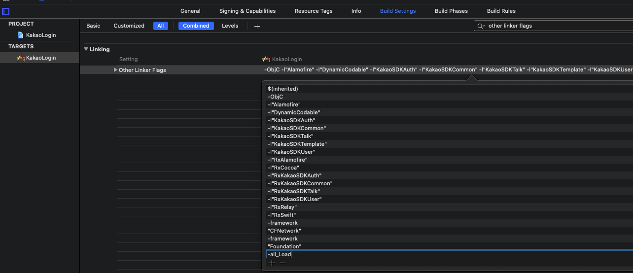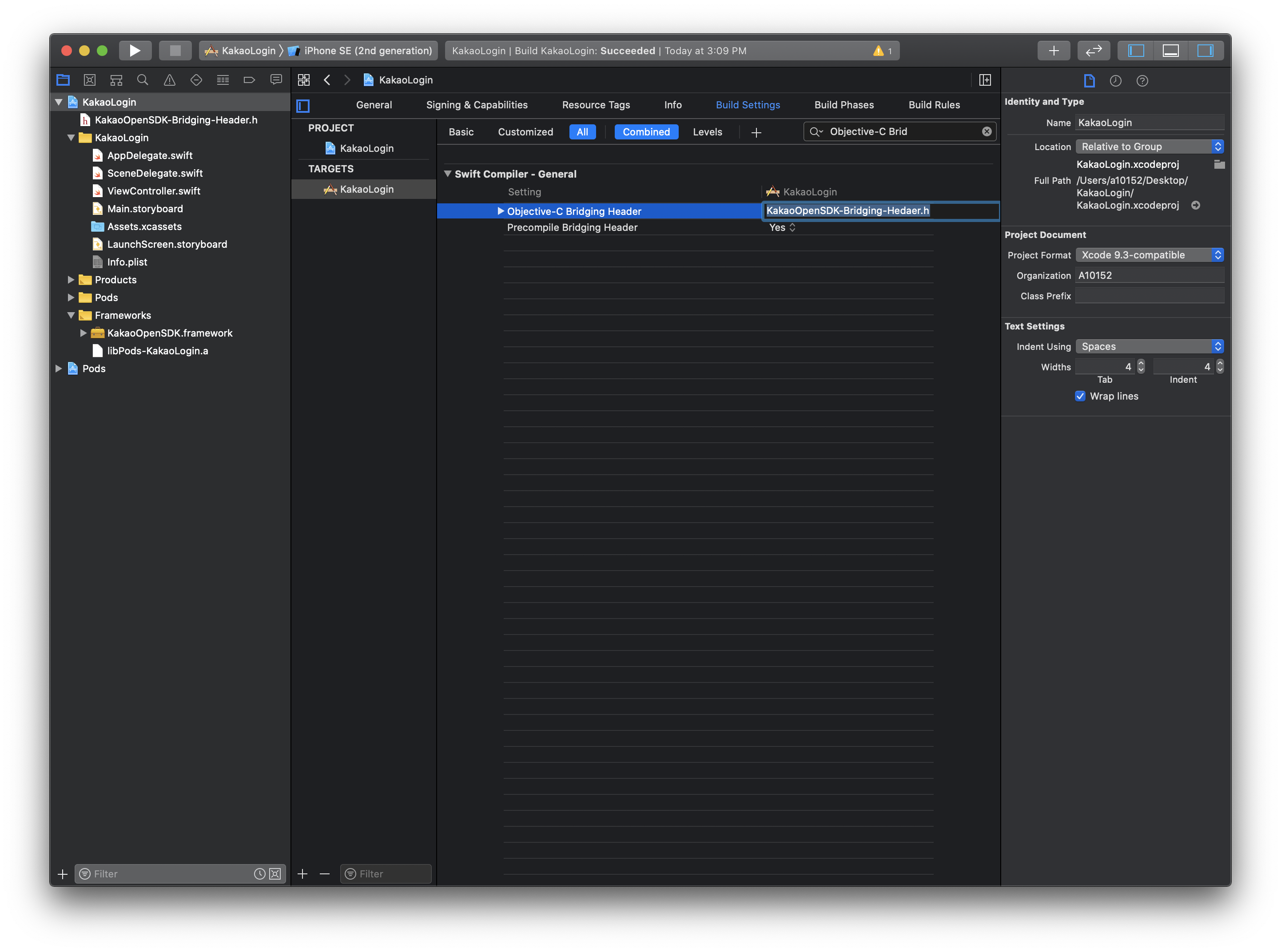 Objective-C Bridging Header에 "KakaoOpenSDK-Bridging-Hedaer.h"입력