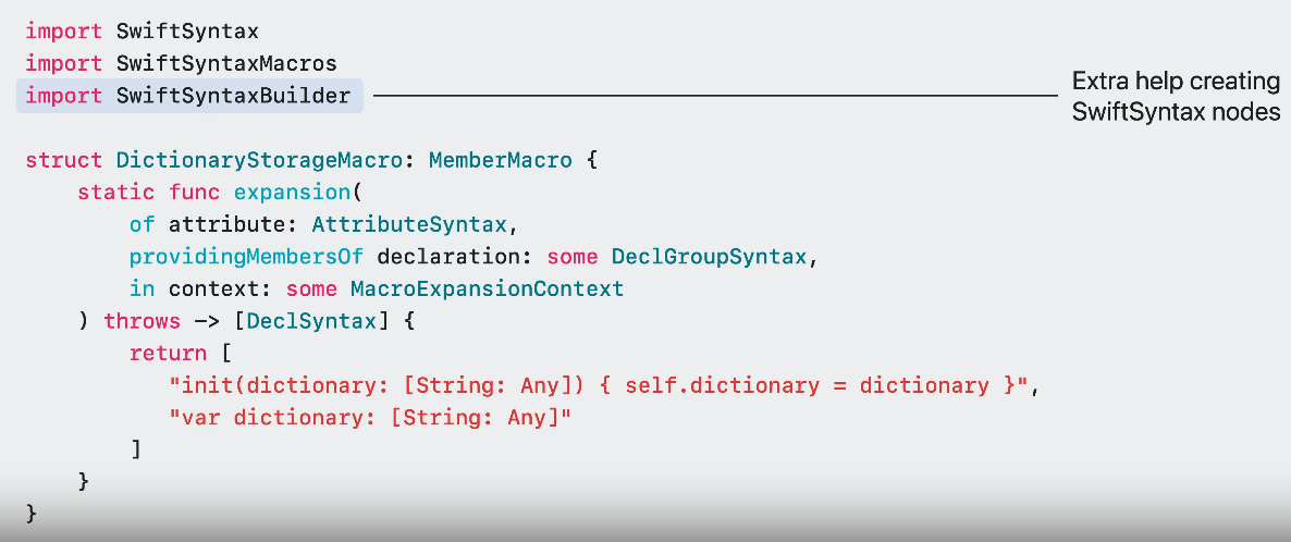 - 본문 중 "var dictionary" 같은 경우는 단순히 문자열 리터럴이 아니고, Swift는 실제로 이를 소스 코드의 조각으로 취급하고 Swift parser에서 DeclSyntax 노드로 전환하도록 요청
