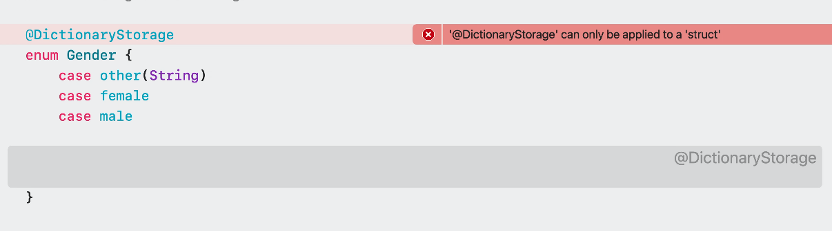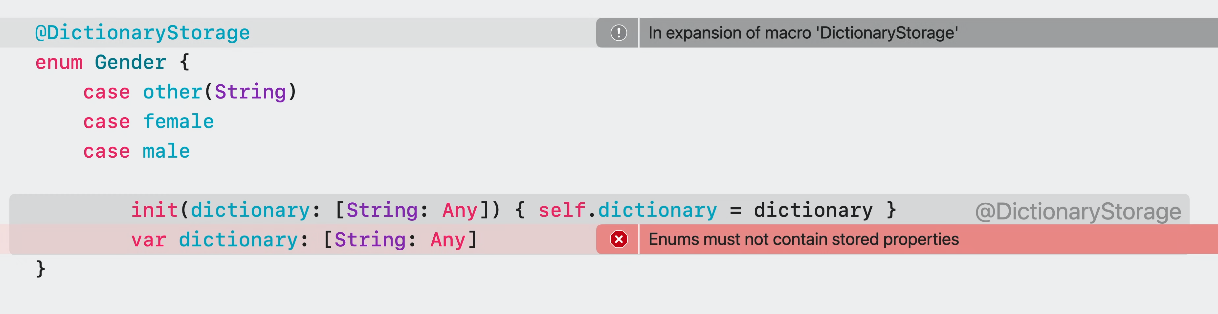 - ex) @DictionaryStorage는 구조체에만 적용할 수 있도록 명확한 오류 메시지를 생성하도록 매크로 구현부를 수정