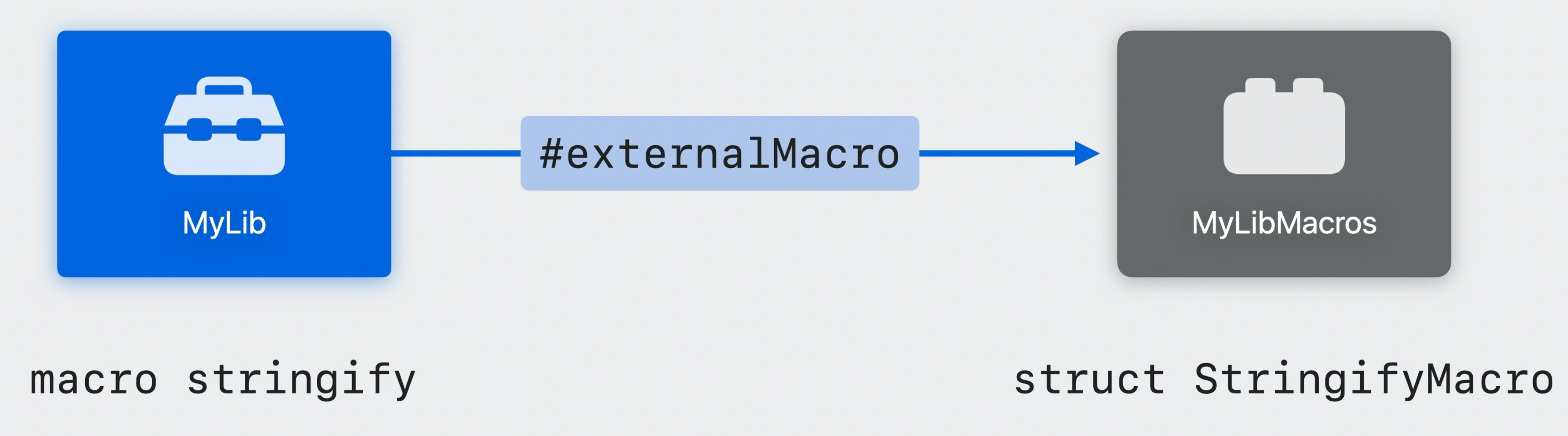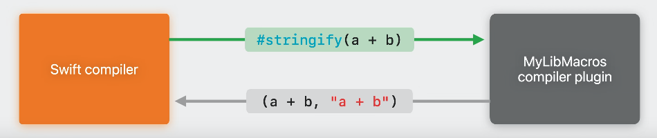 - 즉 #externalMacro를 사용하면 Swift compiler가 플러그인에게 StringifyMacro라는 유형에 대해 expansion(확장)을 요청하는 것