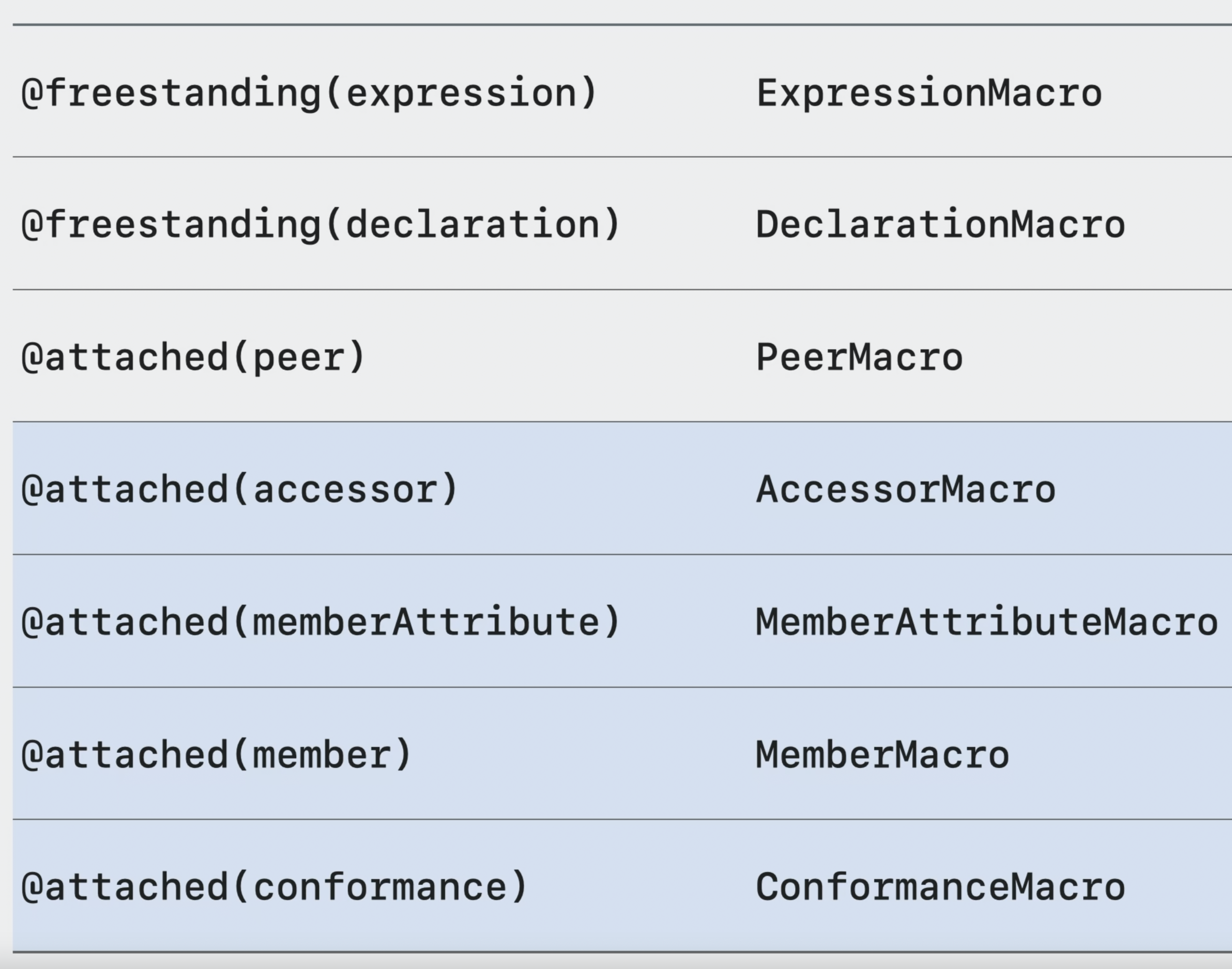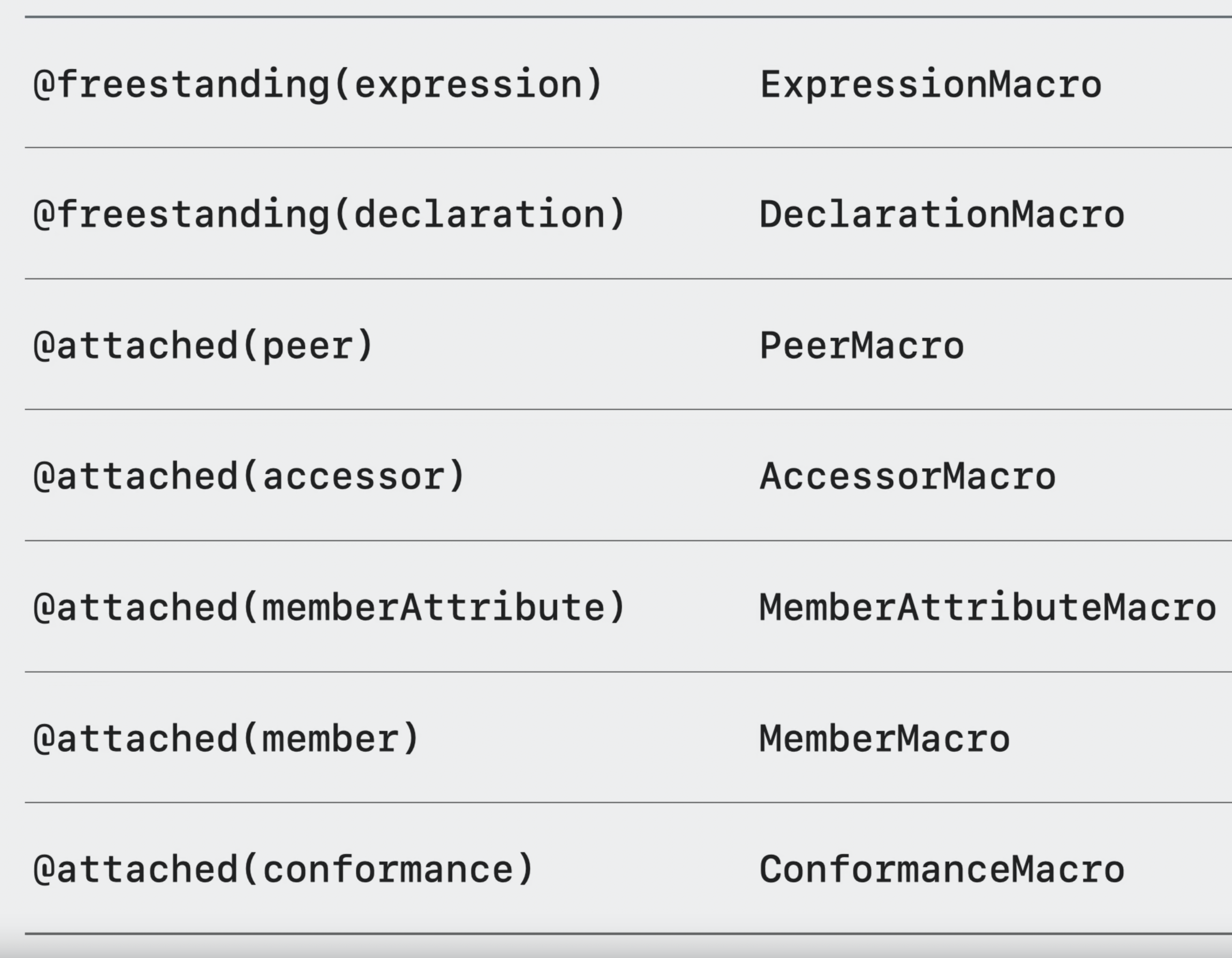 - 이전 포스팅 글에서 알아봤던 매크로의 7가지 role은 각 해당 프로토콜이 있으며 구현은 매크로가 제공하는 각 열할에 대한 프로토콜을 준수하여 구현