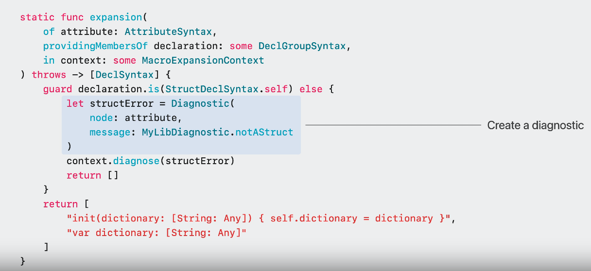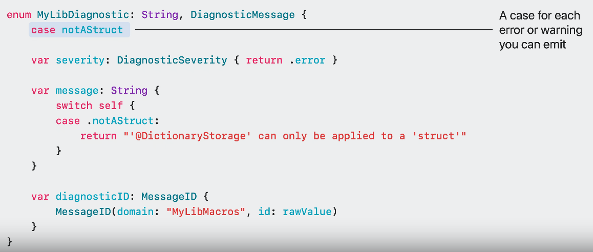 - 이러한 내용을 정의하여 context.diagnose()에 넘기면 swift compiler에게 알려주어 에러 메시지를 띄우기 가능