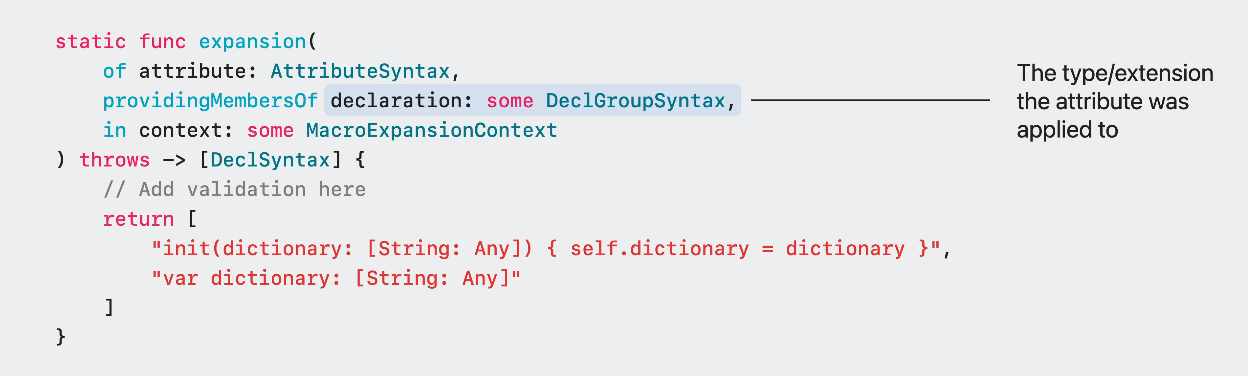 - 해당 메소드의 의미: 매크로가 사용될 때 Swift compiler가 구성원 역할을 확장하기 위해 호출하는 것