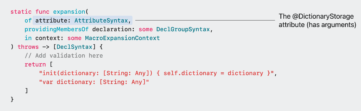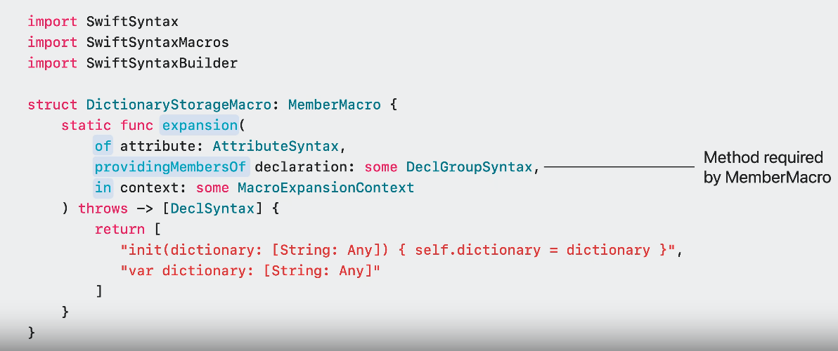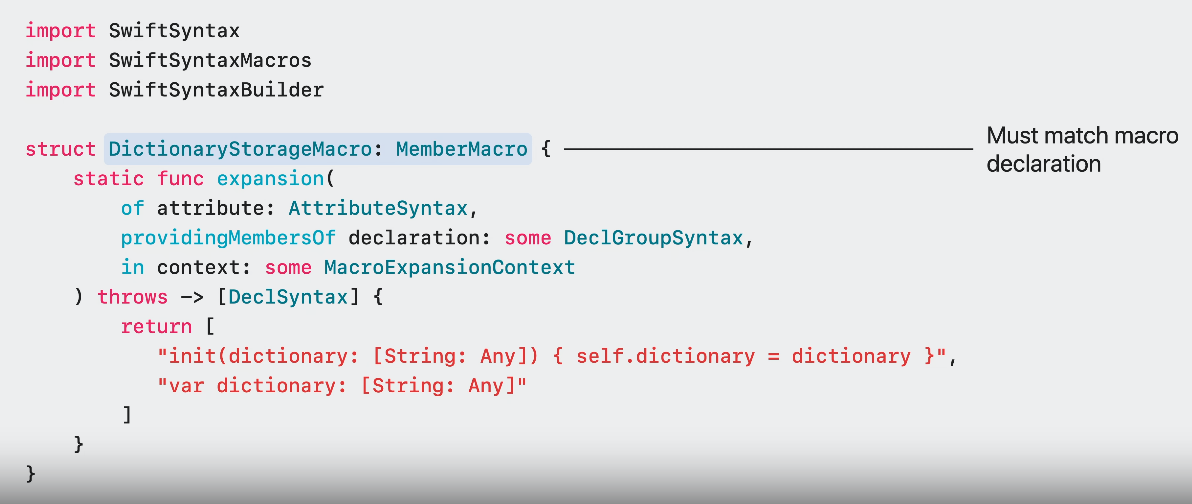 - 주의할점) expansion은 instance method가 아닌 static method이며, 이 이유는 Swift가 실제로 DictionaryStorageMacro유형의 인스턴스를 생성하지 않도록 하기 위함