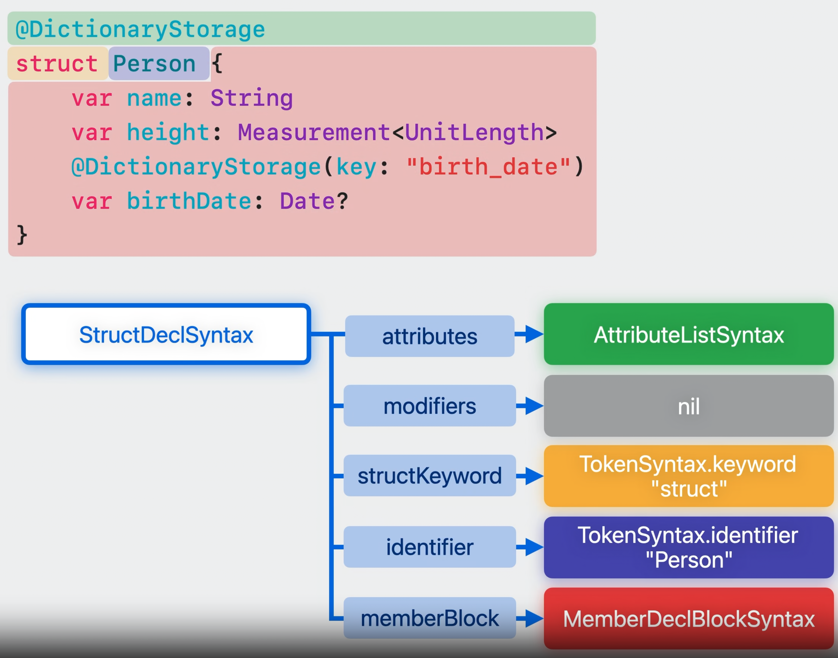 - 아래 Person 구조는 "StructDeclSyntax"라는 유형의 인스턴스로 표현하며 각 가지에서는 소스코드에 해당하는 특정 표현식들을 분류한것
