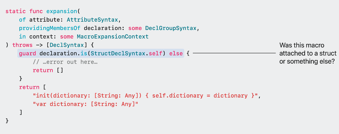 - macro 구현부에서 StructDeclSyntax로 타입 체크가 가능