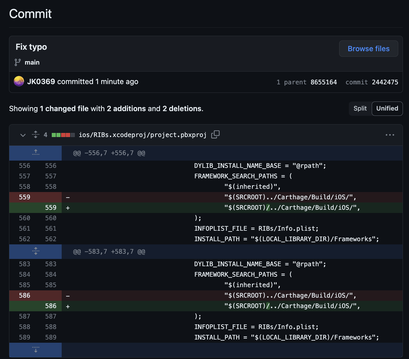 - 포크한 RIBs 프로젝트의 Build Settings에서 framework search path를 검색