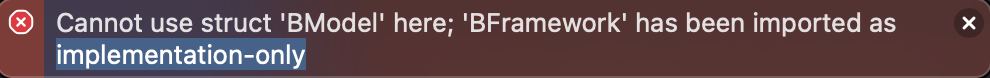 - @_implementationOnly를 사용하면 AFramework안에서 BFramework관련 타입을 리턴하거나, 프로퍼티로 갖거나, 파라미터로 갖을수 없게 컴파일 에러가 발생