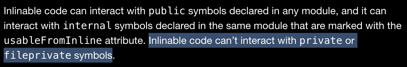 - 같은 모듈 내에서만 사용할 수 있는 @inlinable 키워드처럼 동작