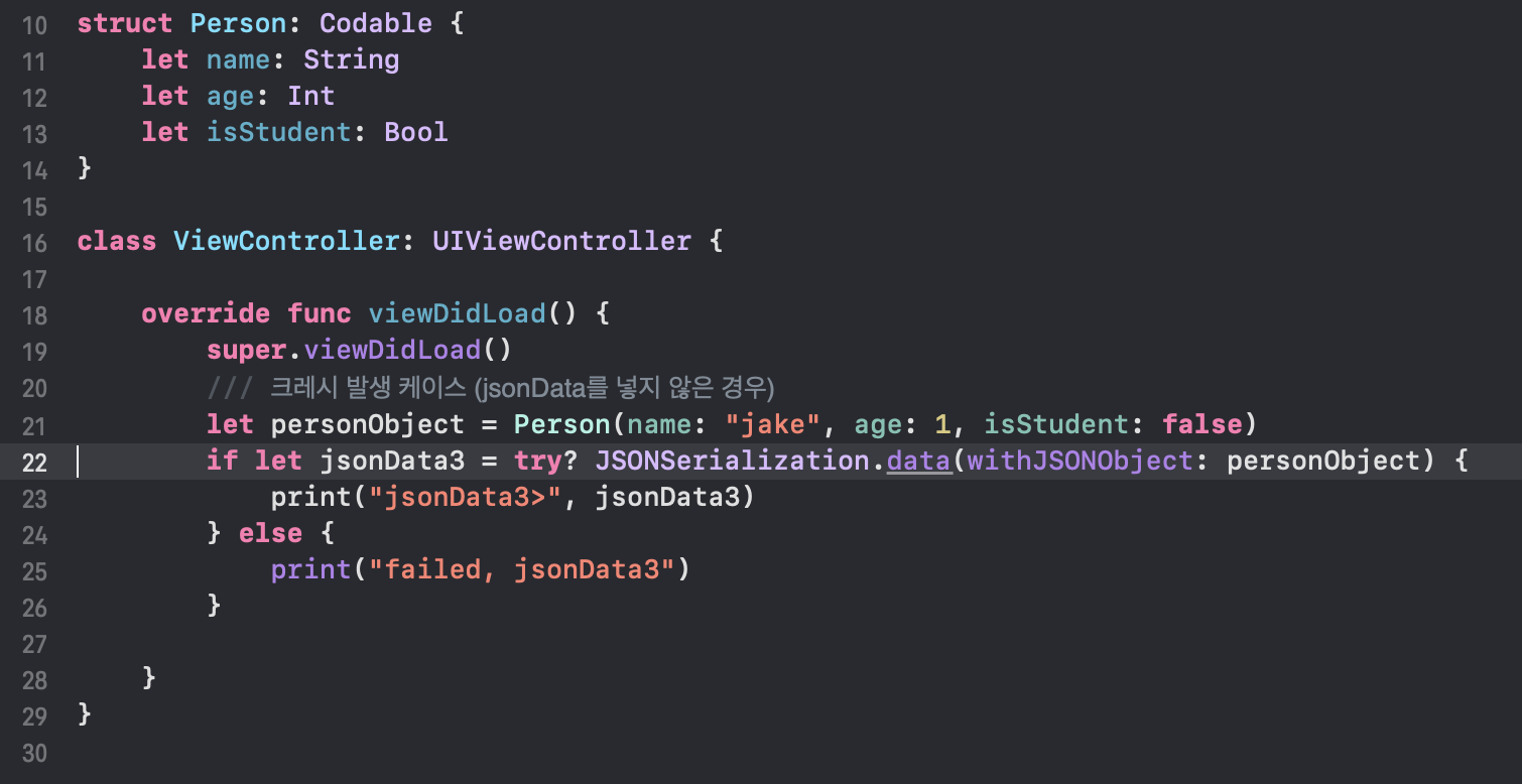 (크래시가 발생한 부분 - JSONSerialization에서 jsonData가 아닌, 일반 object를 넣은 경우 발생)