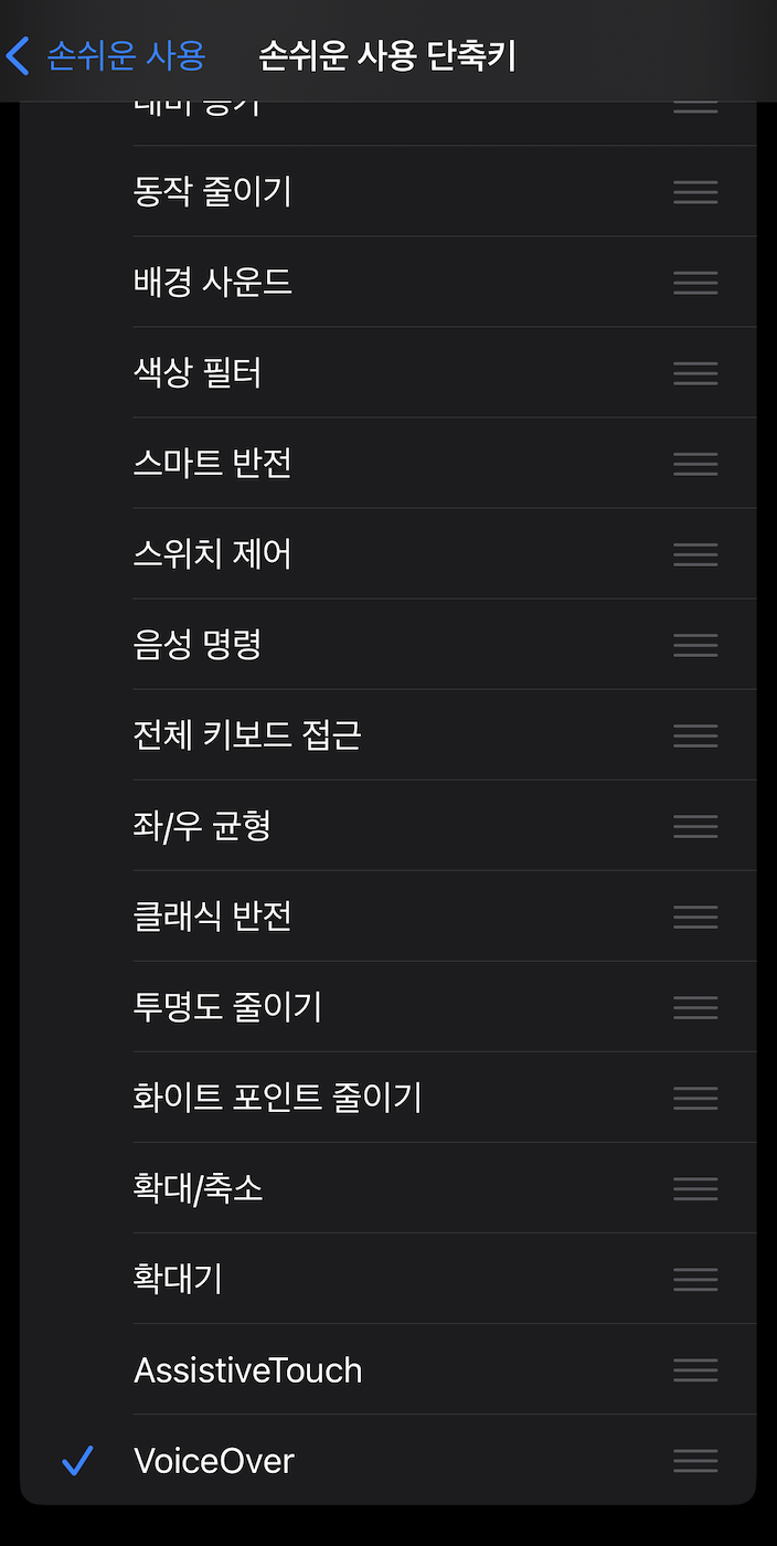 - 활성화: 설정 > 손쉬운 사용 > 손쉬운 사용 단축키 > 여기서 VoiceOver 선택하면 완료