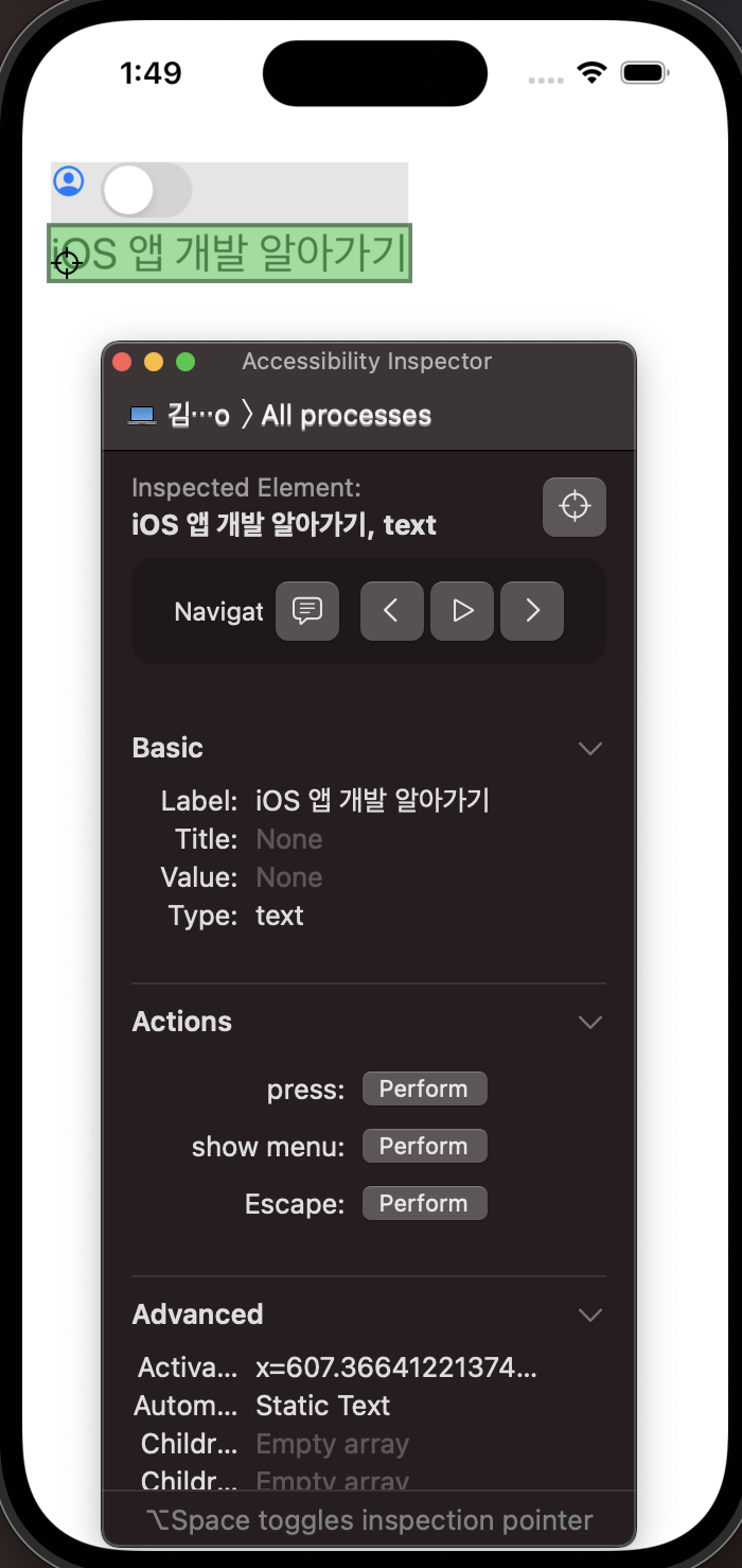 - Traits요소에 이미 text가 있기 때문에, 만약 Label에도 text라는 문구를 넣으면 보이스 오버가 읽어줄 때 "텍스트 iOS 앱 개발 알아가기 텍스트"라고 텍스트가 두 번 읽어주기 때문에 Type의 이름을 Label에 넣지 않게 주의할 것
