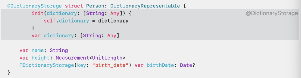 @attached(memberAttribute) 프로퍼티 위에 매번 선언하는 DictionaryRepresentable 생략 가능