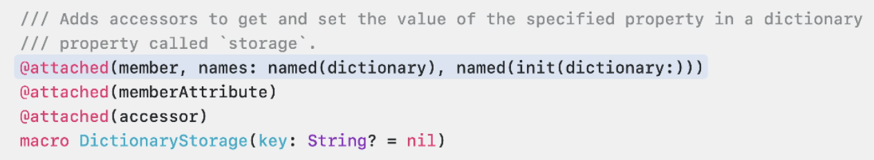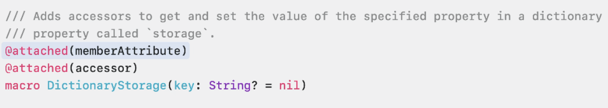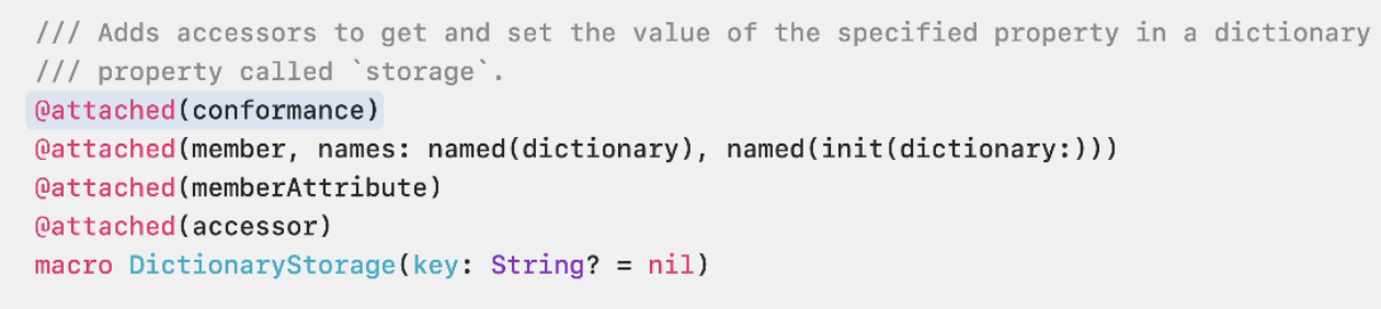 - attached(accessor): property에 get, set, willSet, didSet과 같은 접근자를 추가하는 매크로