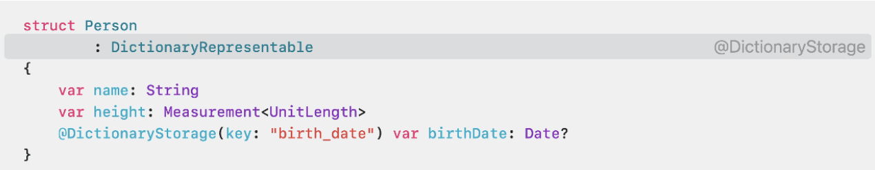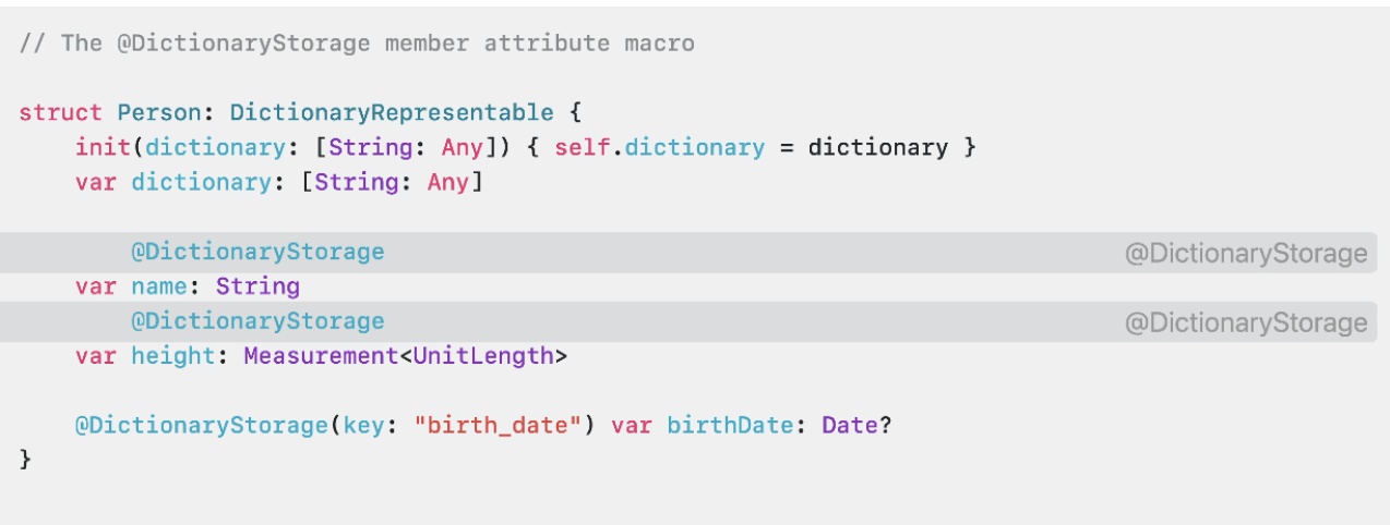 ex) @attached(conformance)를 추가하여 Person 구조체에 일일이 DictionaryRepresentable을 준수하도록 해주지 않아도 됨
