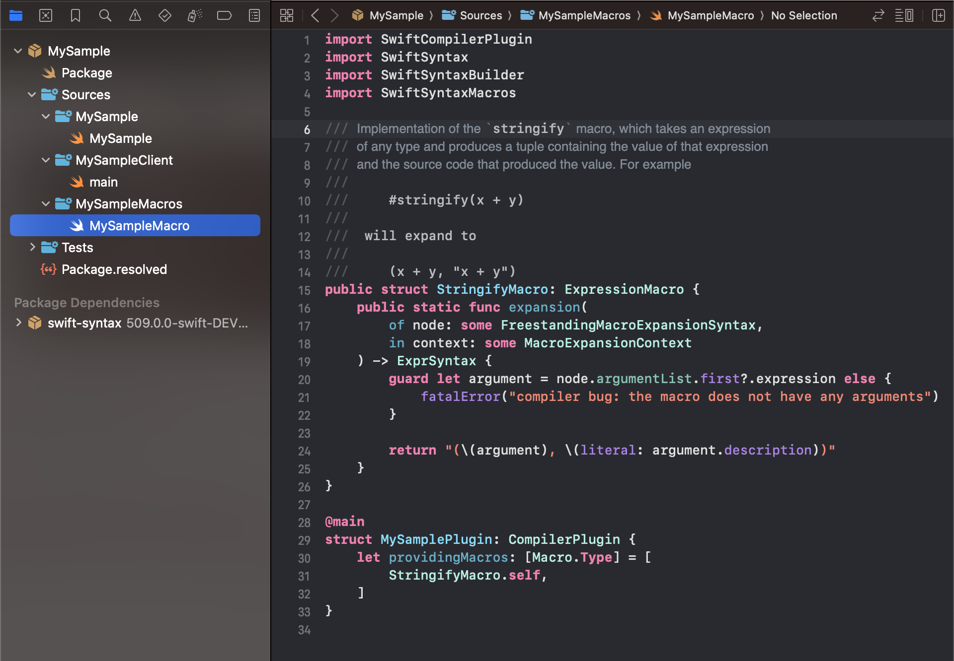 - MySampleMacro.swift은 매크로 로직이 들어있는 핵심적인 파일