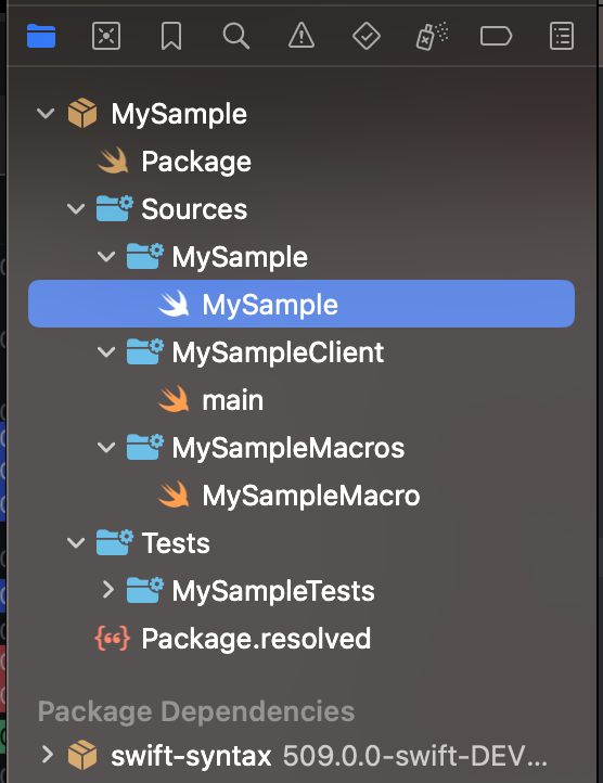 - MySample.swift: 직접 정의한 매크로 로직을 외부에서 사용할 수 있도록 인터페이스를 맞춰주는 파일