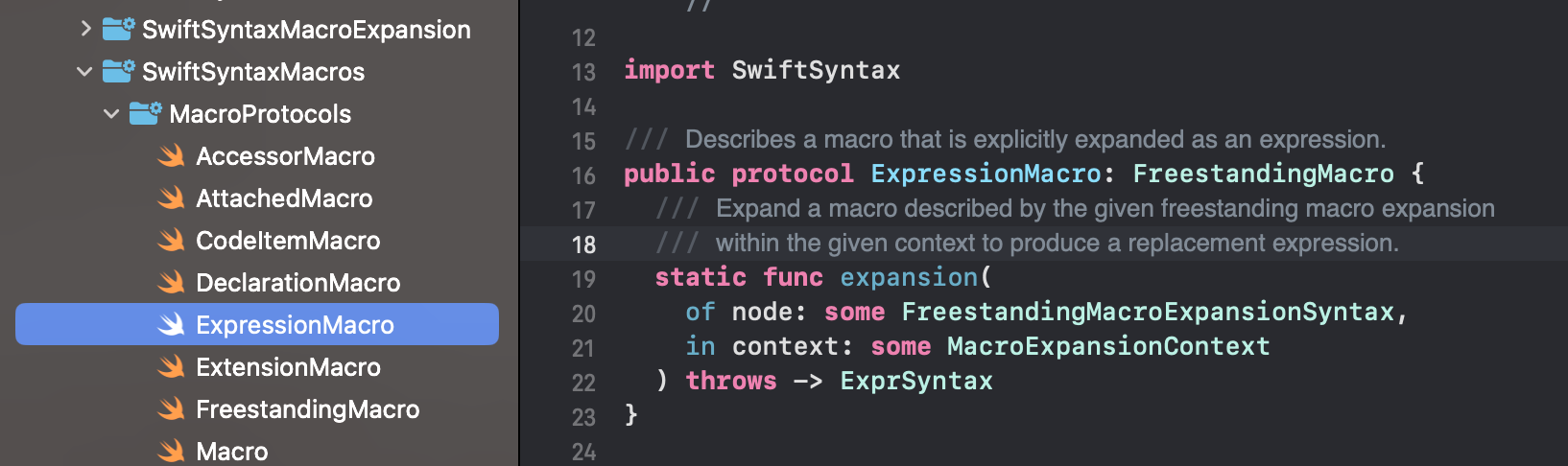 - expansion 함수를 보면 node라는 인수와 반환 타입 ExprSyntax가 중요