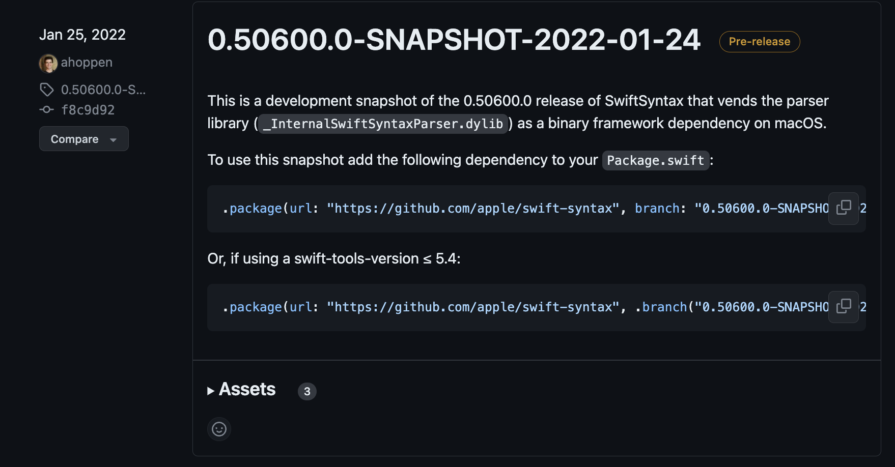 - swift-syntax Git repo에서 최초 Release를 보면 2022년 1월 25일로, 오랫동안 개발된 것은 아님을 확인