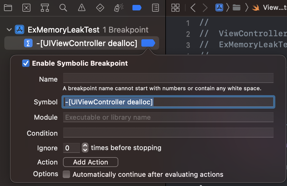 [iOS - swift] Memory Leak 쉽게 테스트하는 방법 (Symbolic Breakpoint)