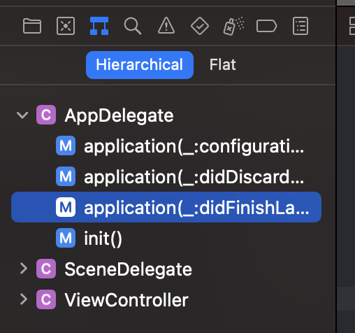 (Xcod14 이하에서는 3번째 탭이 파일 구조, class, method, proprety로 표현)
