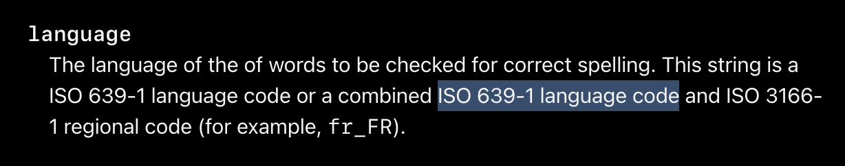 - rangeOfMisspelledWord(in:range:startingAt:wrap:language:) 메소드를 사용
