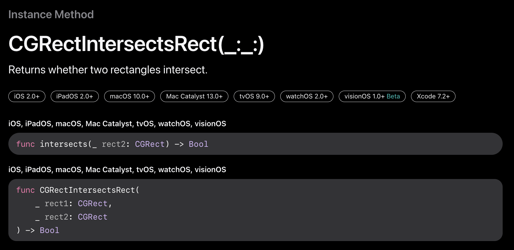 https://developer.apple.com/documentation/coregraphics/1454747-cgrectintersectsrect