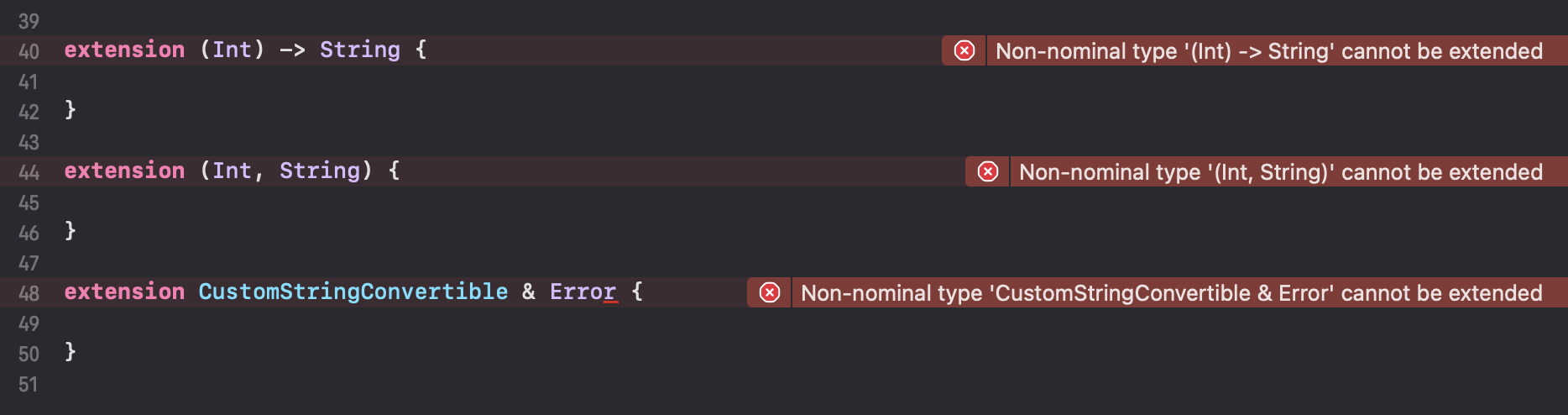 - Any를 확장하기 위해서 extension Any를 하게되면은 Non-nominal type이라는 컴파일 에러가 발생
