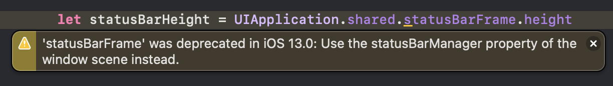 - 기존에 statusBar의 heigth를 구하려고 하면, statusBarFrame 이라는 기존에 있던 프로퍼티가 iOS13에서 deprecated되었다는 경고 메시지가 노출