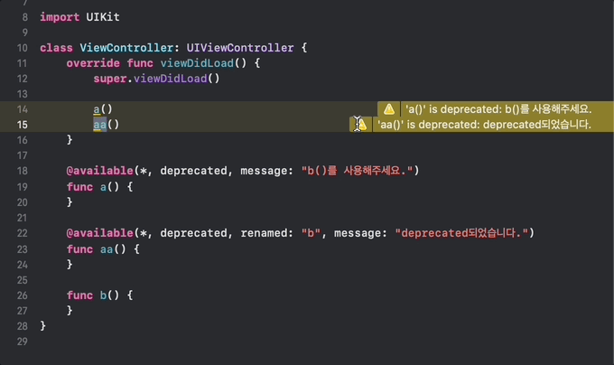 [iOS - swift] deprecated 알림 표시 방법 @available(*, deprecated, message:), @available(*, deprecated, renamed:, message:)