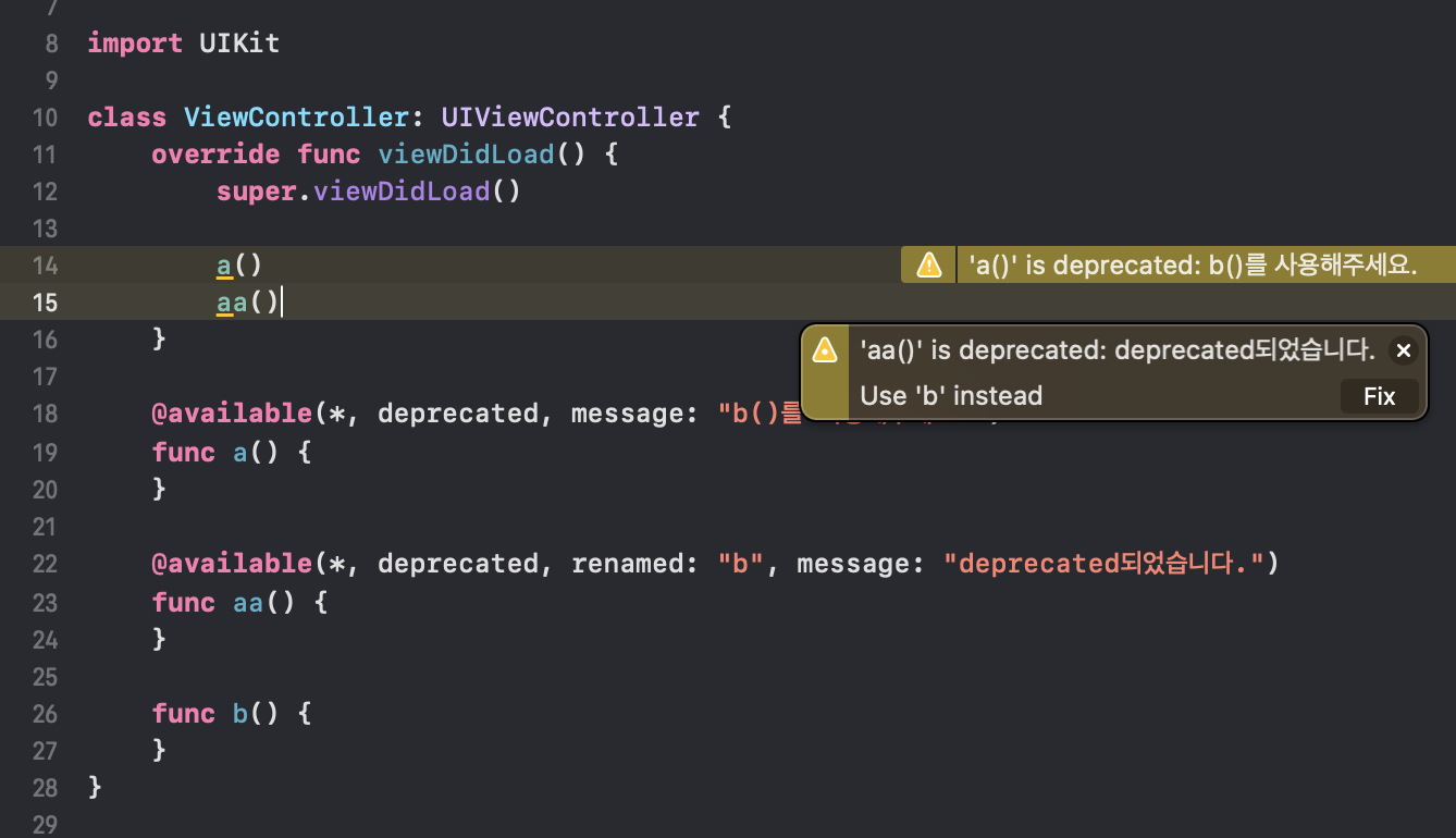 @available(*, deprecated, message: "b()를 사용해주세요.")