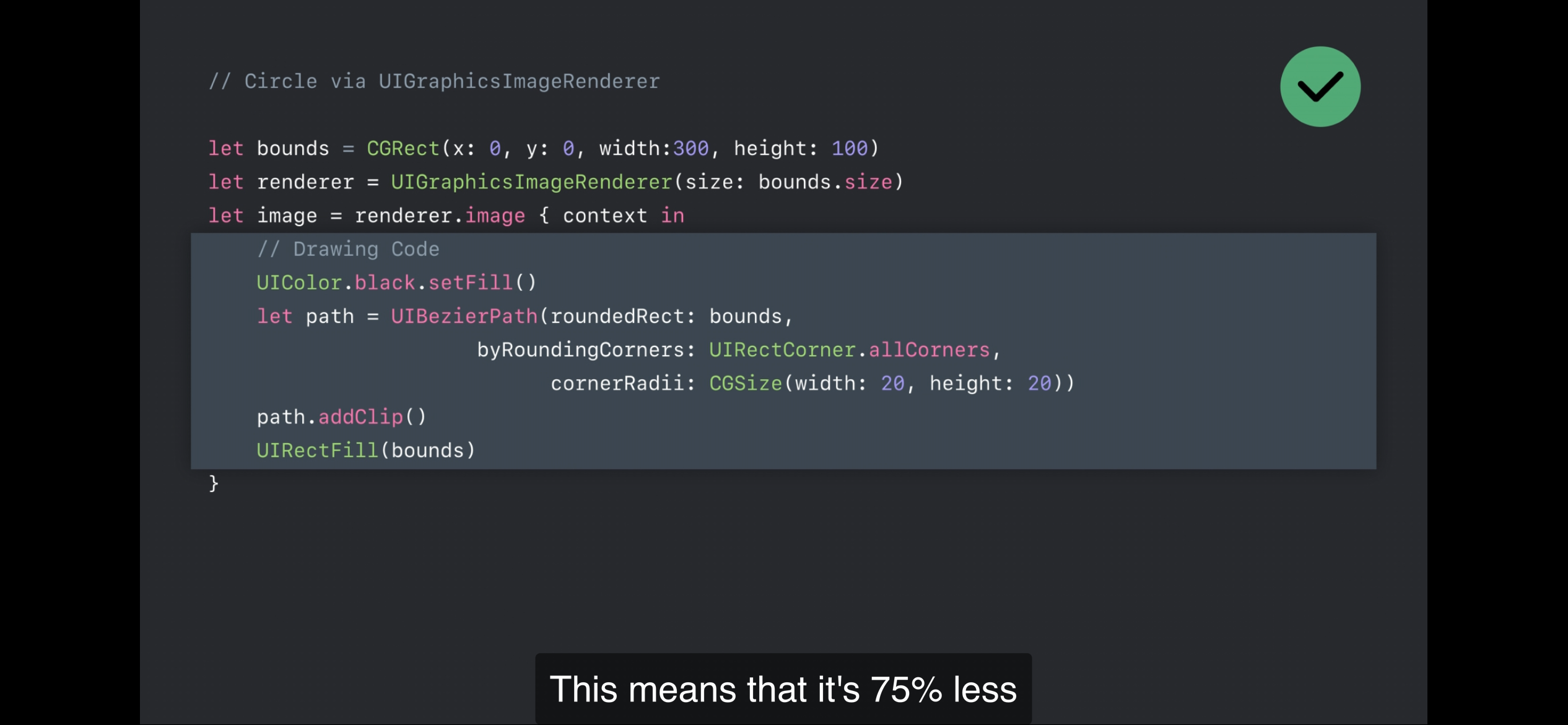 - WWDC 2018 자료에 의하면, UIGraphicsImageRenderer을 사용한 것보다 메모리 사용량에 있어서 75% 적고, 성능도 50% 향상