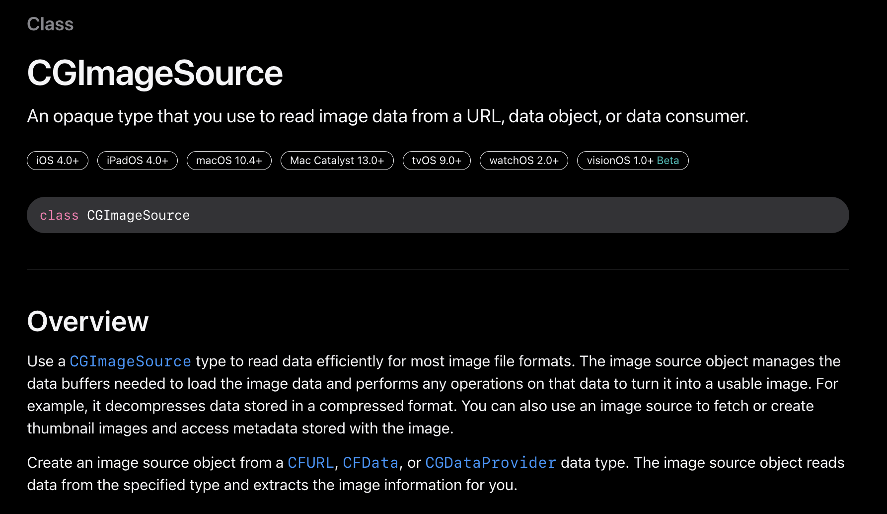 - CGImageSource 클래스는 이미지 파일이나 데이터 소스에서 이미지를 생성하는 데 사용