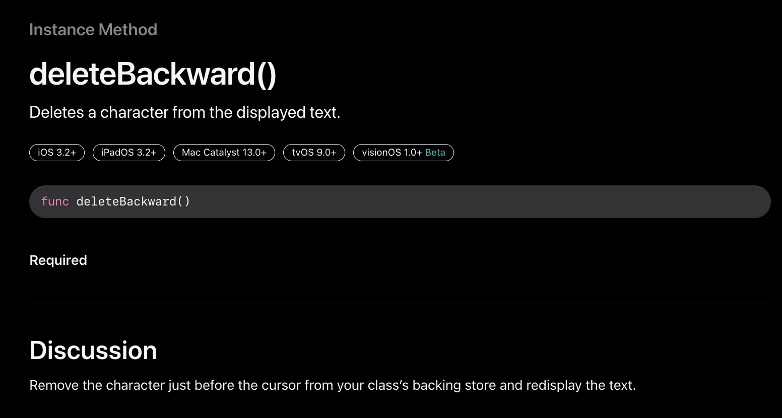 - https://developer.apple.com/documentation/uikit/uikeyinput/1614572-deletebackward
