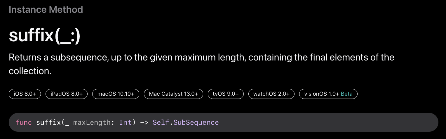 - https://developer.apple.com/documentation/swift/string/suffix(_:)