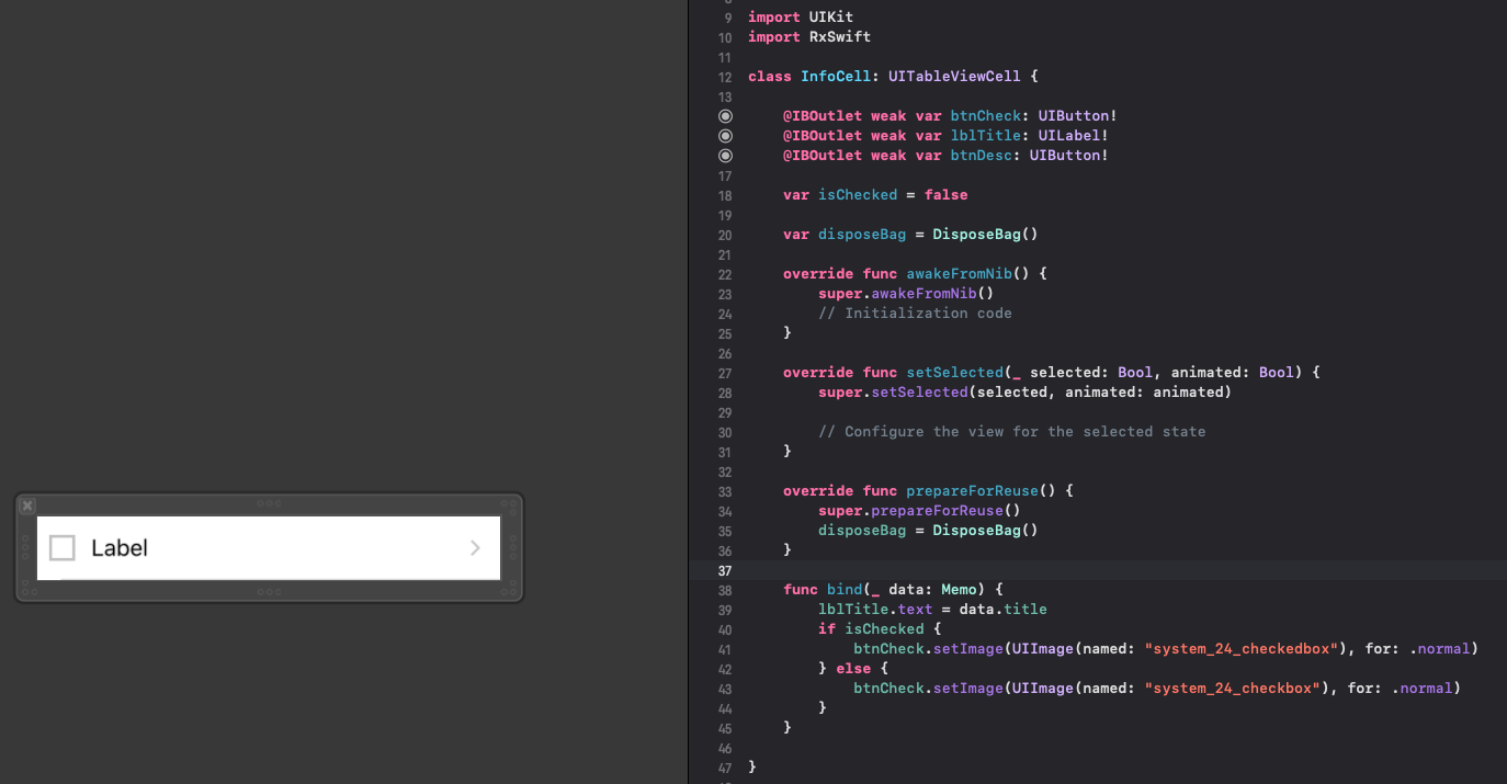 정의 방법 - cell을 정의하는 .swift파일에 (#그림1 에서) bind함수 정의