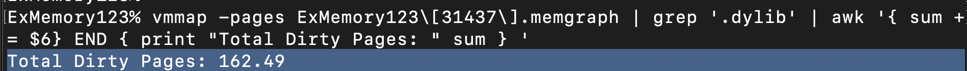 vmmap -pages {mem_graph_name}.memgraph | grep '.dylib' | awk '{ sum += $6} END { print "Total Dirty Pages: " sum } '