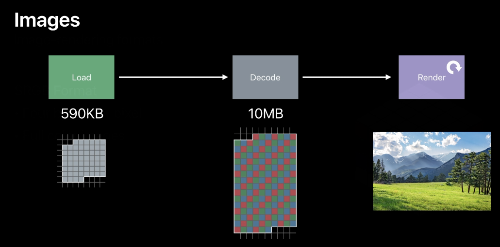 - iOS에서는 wide format의 이미지를 렌더링할 수 있는데, 이 wide format은 픽셀을 2배 늘린 것이고 RGB(with alpha) 각 2byte가 필요하므로 1pixel당 총 8btye가 필요