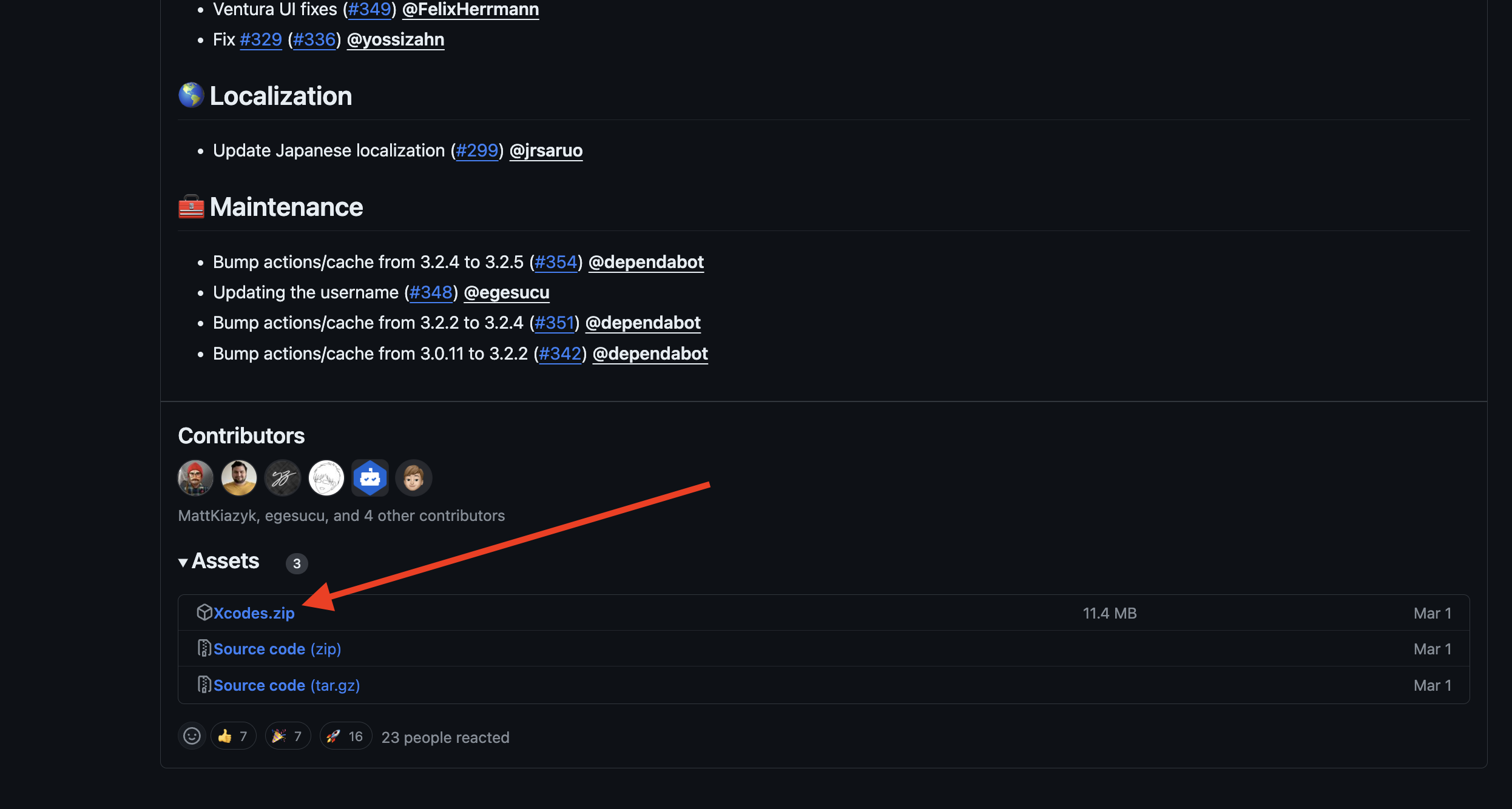 - github 페이지가 열리면 가장 하단으로 스크롤 후 Xcodes.zip 선택하여 다운로드