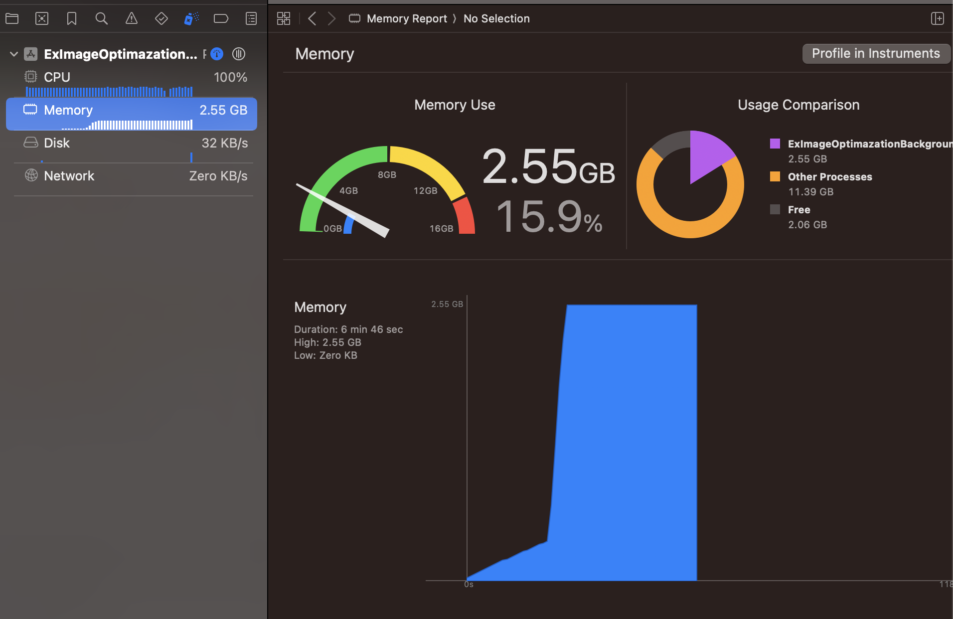 - Xcode에서 단순히 메모리 상황을 보면 2.5GB나 사용하는 형태