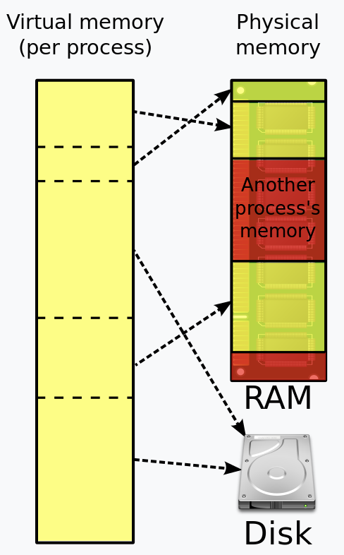 - 하드웨어 RAM (맥북에서의 16G 등)을 물리적 RAM이라고 한다면, 이 16G의 부족한 공간을 위해서 디스크 공간도 같이 사용하는 방법