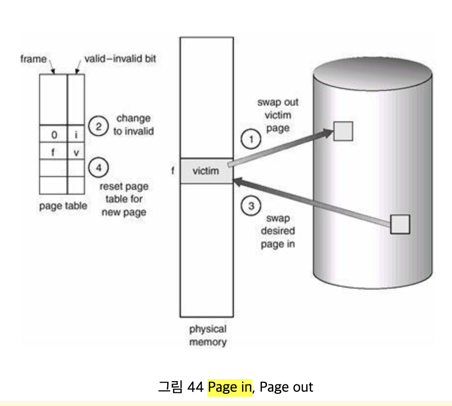 - page out: physical메모리에 page에 대응하는 데이터가 없어서, physical메모리에 있는 어느 한 page와 disk에 있는 page랑 swap해야하는데, 이 때 physical memory에서 사용하지 않은 공간을 내준다는 의미로 page out이라 명명