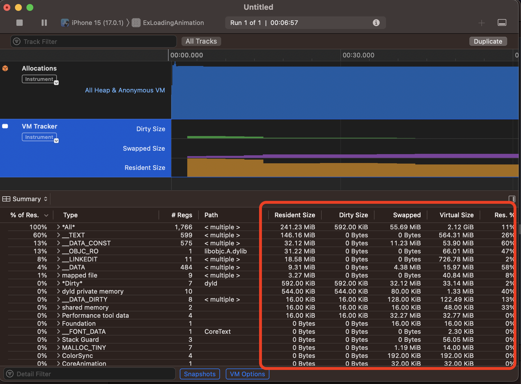 2. 메모리 프로파일링 - VM Tracker을 사용하여 메모리 프로파일링하기 (resident size, dirty size, swapped size, virtual size)