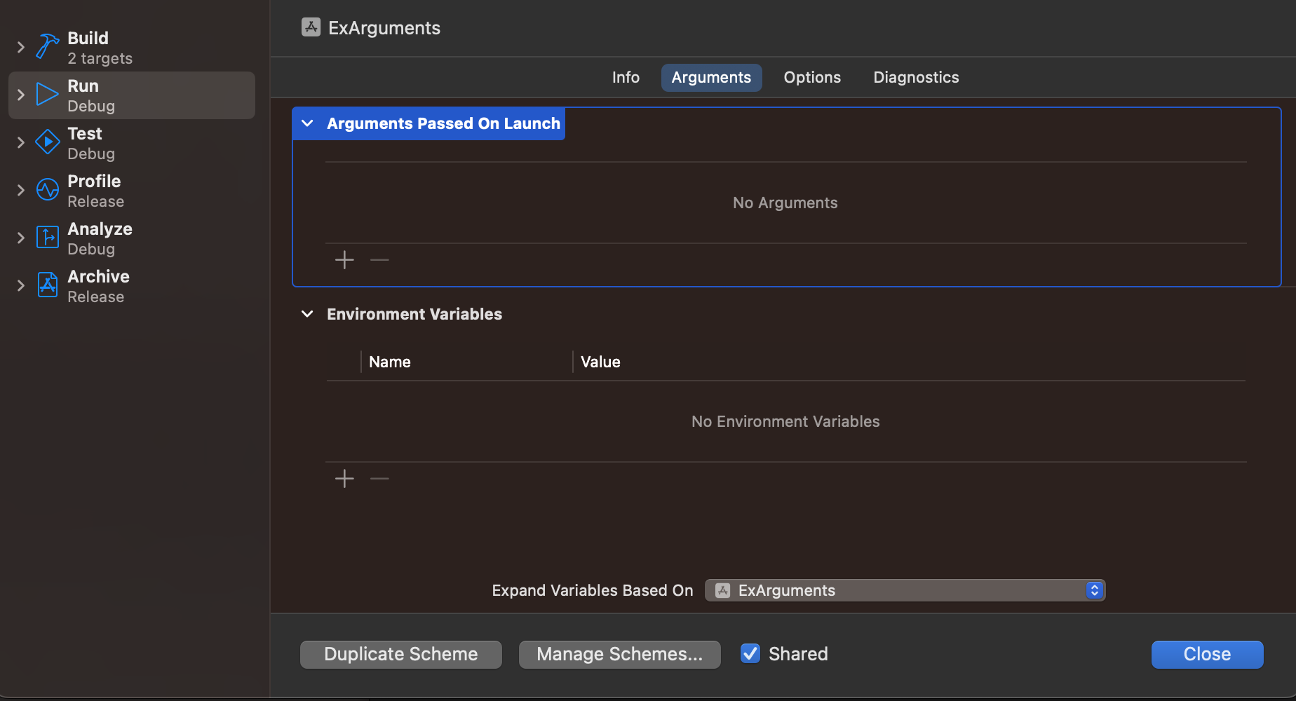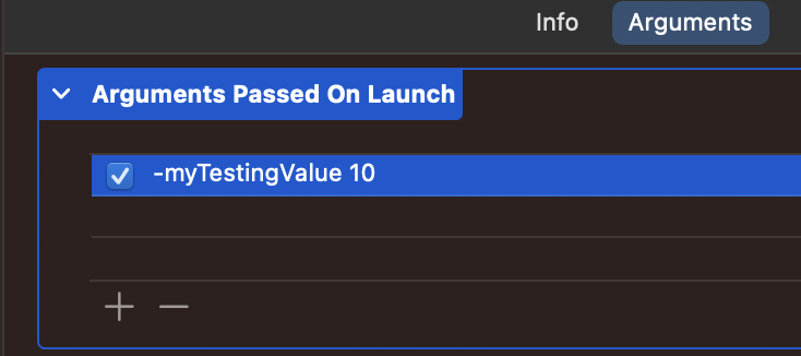 - 왼쪽 탭에서 Run 선택 > 위 탭에서 Arguments 선택 > Arguments Passed On Launch > +버튼 클릭