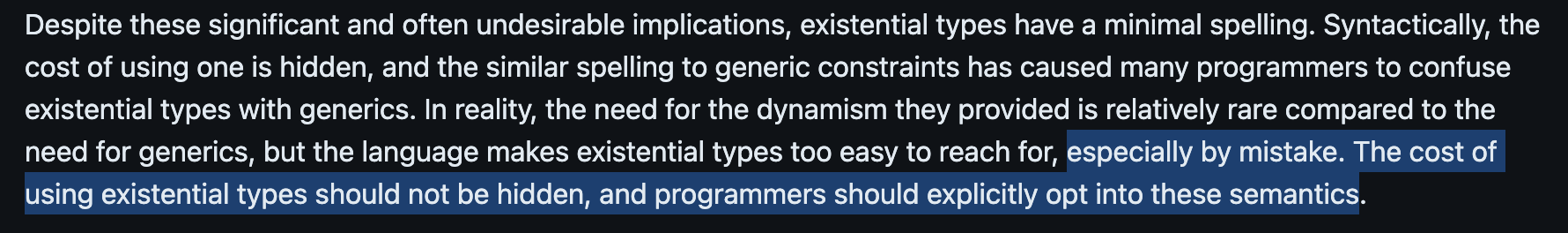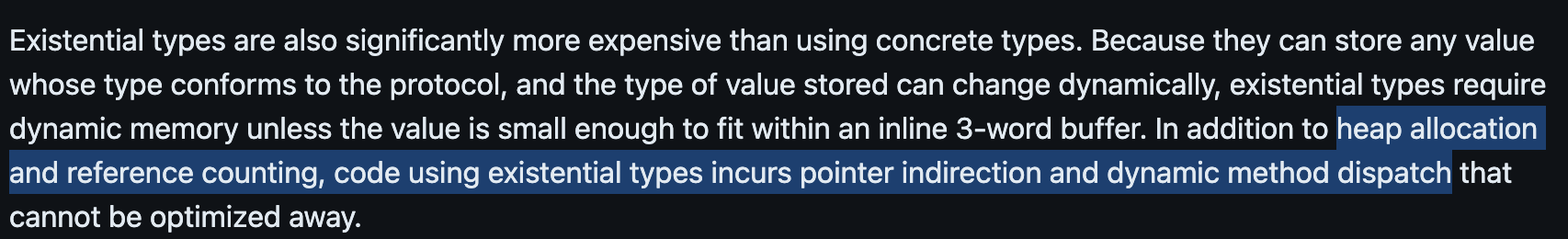 - Existential Type을 사용할 때, dynamic dispatch가 일어나고 적지않은 메모리 할당 등 비용이 비싼 단점이 존재하여 프로그래머에게 Existential Type을 사용할땐 주의하게끔 any 키워드를 붙여서 사용하라는 의미