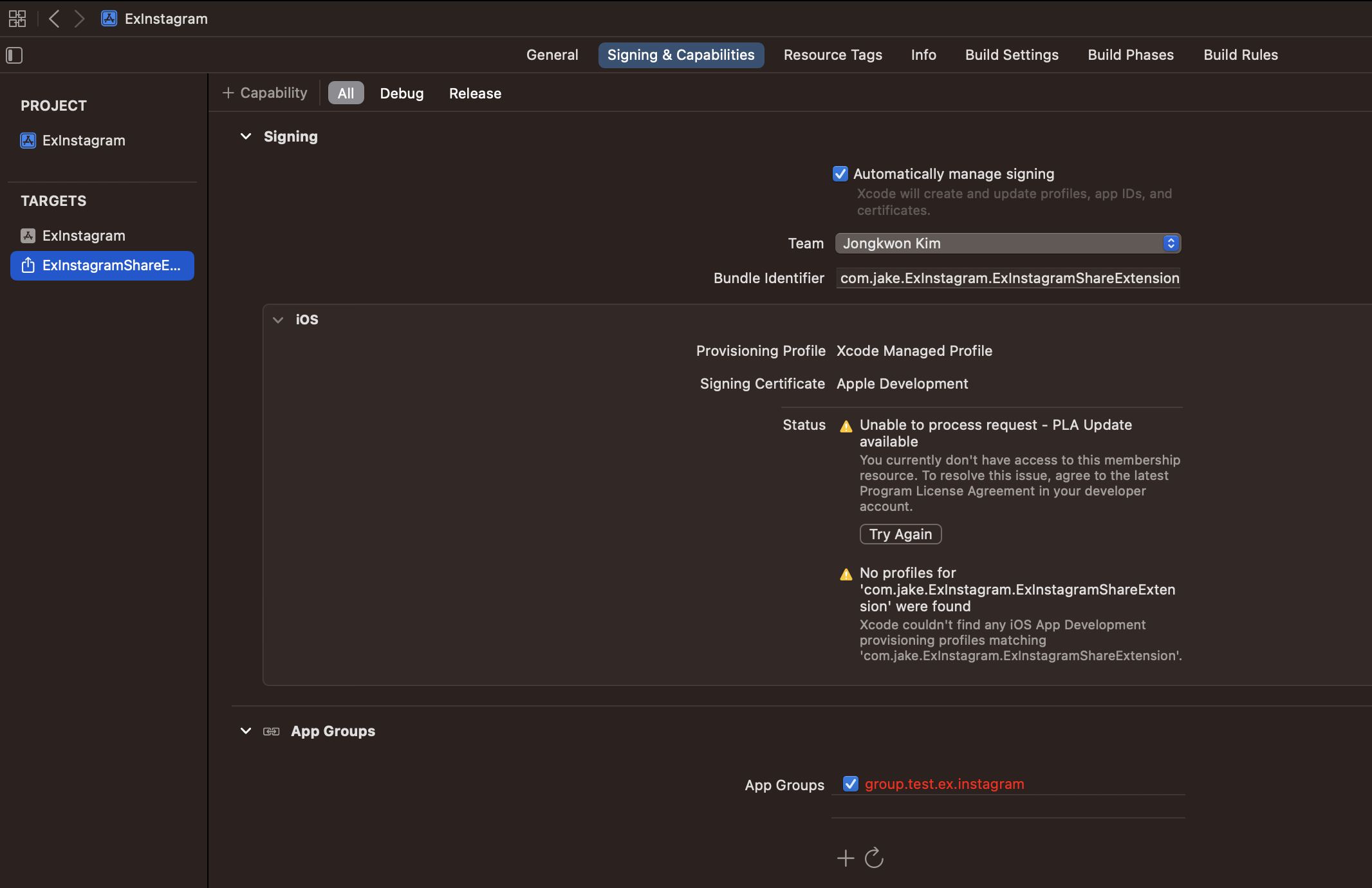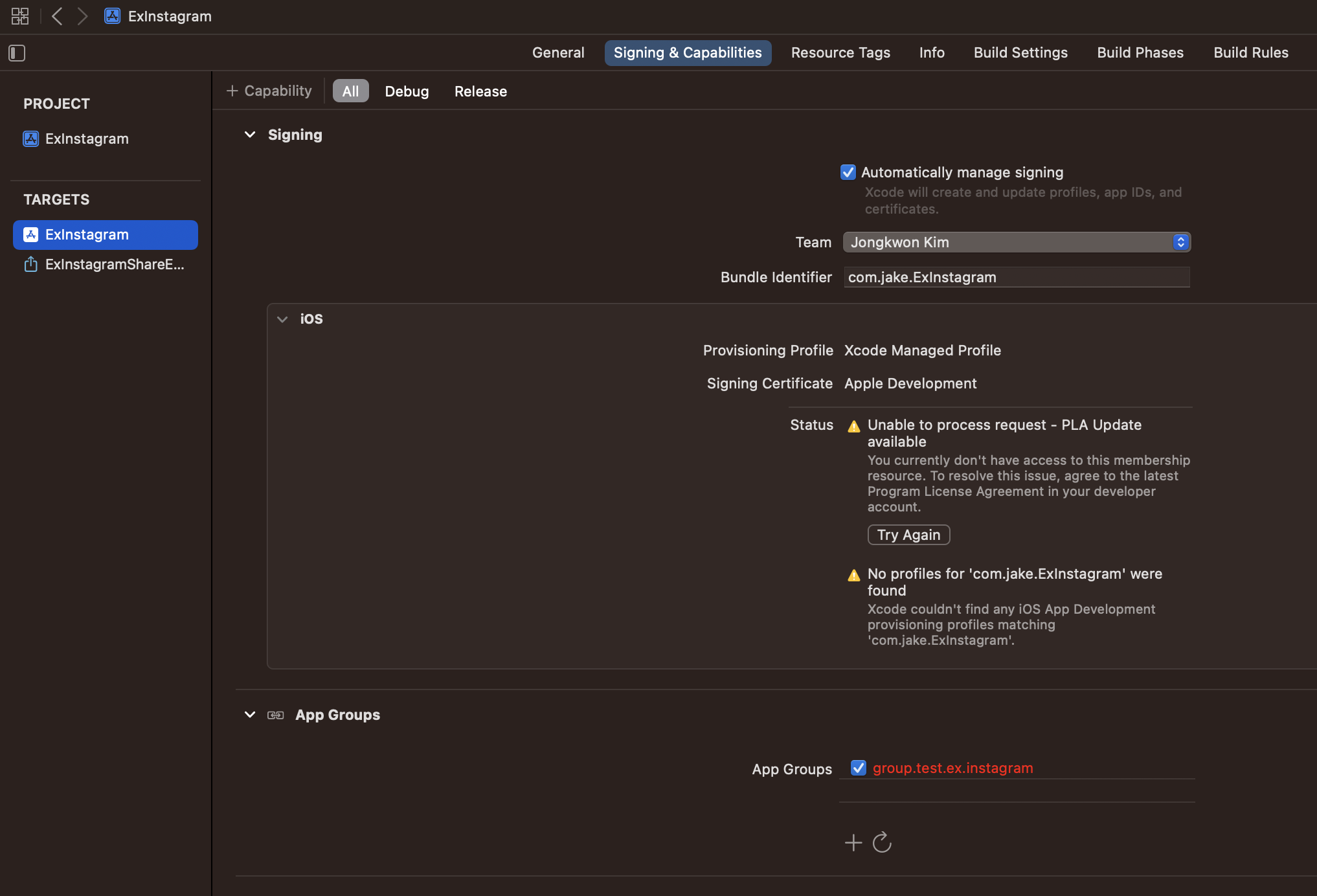 - (수동으로 하려면 apple develper 사이트에서 provisioning profile 만드는 곳에서 App Groups를 활성화하고, identifier를 생성)