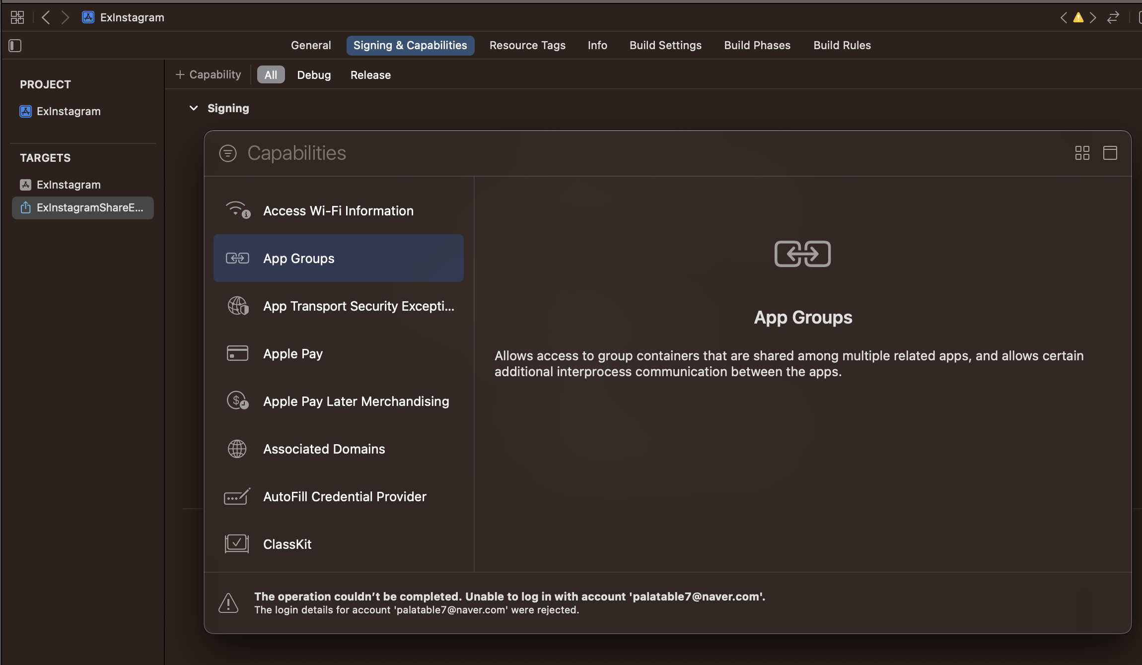 - 인스타그램과 share extension의 데이터가 서로 공유될 수 있게끔 App Groups 설정이 필요