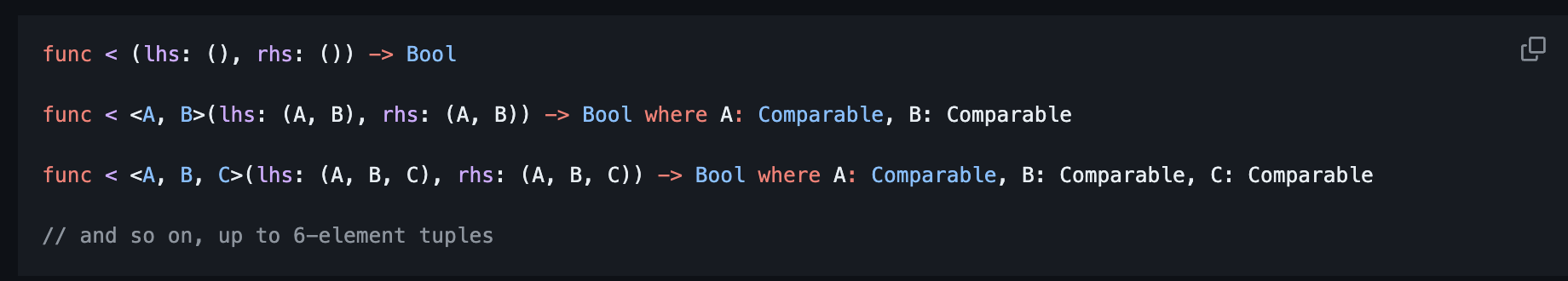 - Swift 5.9미만에서는 아래와같이 여러개의 parameter가 있을때 이 parameter 개수만큼 그대로 튜플로 리턴해주고 싶은 경우 일일이 써주어야하는 번거로움이 존재