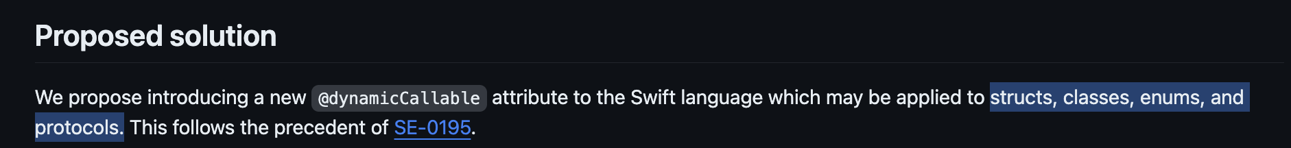 - https://github.com/apple/swift-evolution/blob/main/proposals/0216-dynamic-callable.md